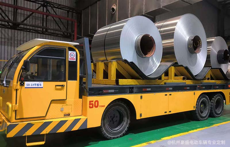 50吨大吨位电动平板运输车应用于钢卷行业