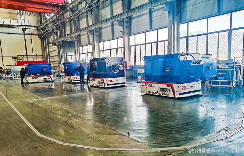 杭州豪盛作为国内领先的重载AGV定制及自动化产线定制厂家,根据生产节拍为该项目设计了6个工位,配置4台定制型20吨重载AGV,设计环形磁条导航路线,结合工位装配实际操作情况由工人确认后车辆自动运行到下一个工位,并在生产过程中上报车辆信息与生产信息,数据汇总至现场大屏,各个工位消耗时间,生产效率,总产量等数据一目了然。