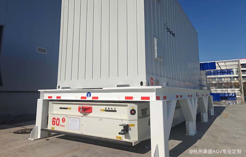 杭州豪盛作为国内领先的重载AGV定制厂家及自动化产线解决方案提供商,根据储能柜生产工艺和实际工况,该项目采用3D SLAM激光导航,配合调度系统、远程PAD,中控服务器一体化系统,实现储能集装箱的全自动流水线生产,通过液压自适应升降台面,托举集装箱马凳,实现60吨货物的多工位自动流转,尺寸满足20尺、40尺集装箱流转需求,工位切换无需行车吊装,极大增加了生产安全性和便捷性,也充分利用了场地进行了功能区块的划分,是储能行业生产装配过程中的得力助手。